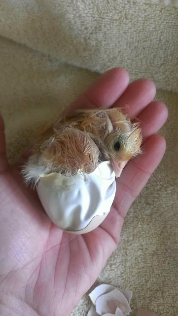 One of the last little ones to hatch was this guy. I saw that he'd zippered the top of his shell completely open, but hadn't pushed the top off and gotten out. It was about 5AM when I noticed he had zippered, and by about 1PM nothing had changed and I started getting worried so I pulled him out. I pulled off the hard part of the shell and he was able to push through the rest and he's doing great now.
